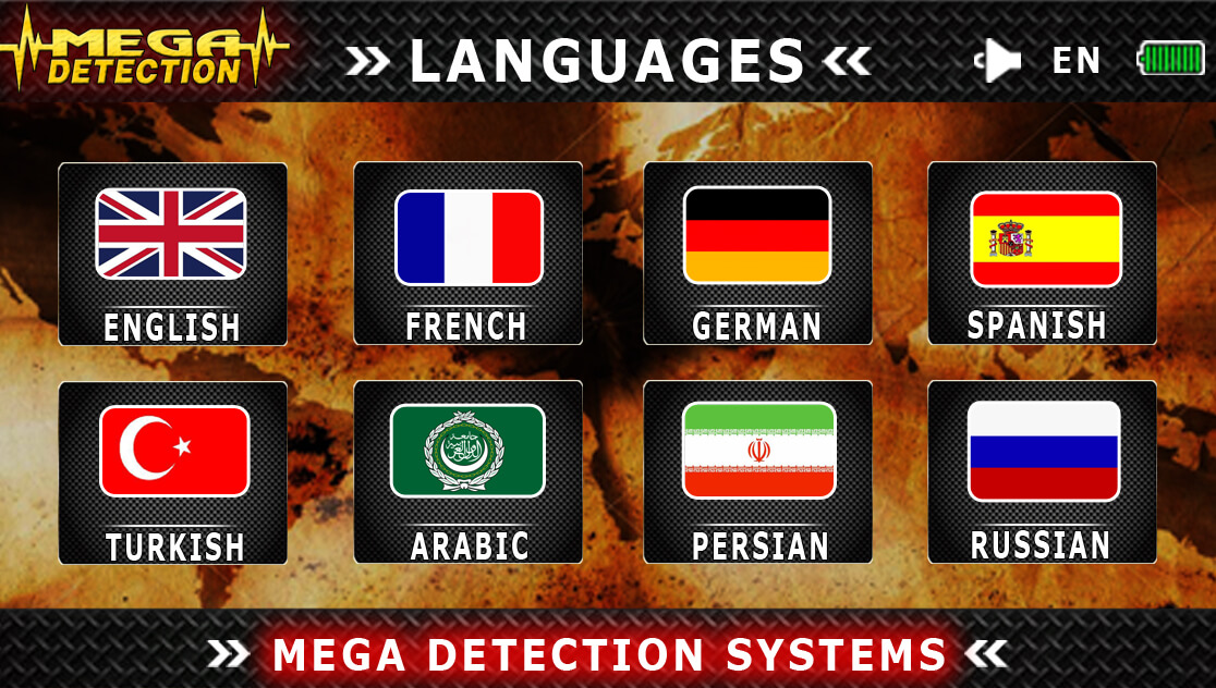 Mega Gold具有8種國際語言提供的簡單易用的多語言圖形用戶界面。打開設備電源時,用戶可以從“語言”菜單中選擇其中之一,即使關閉并重新啟動設備,設備仍將以該語言運行。
